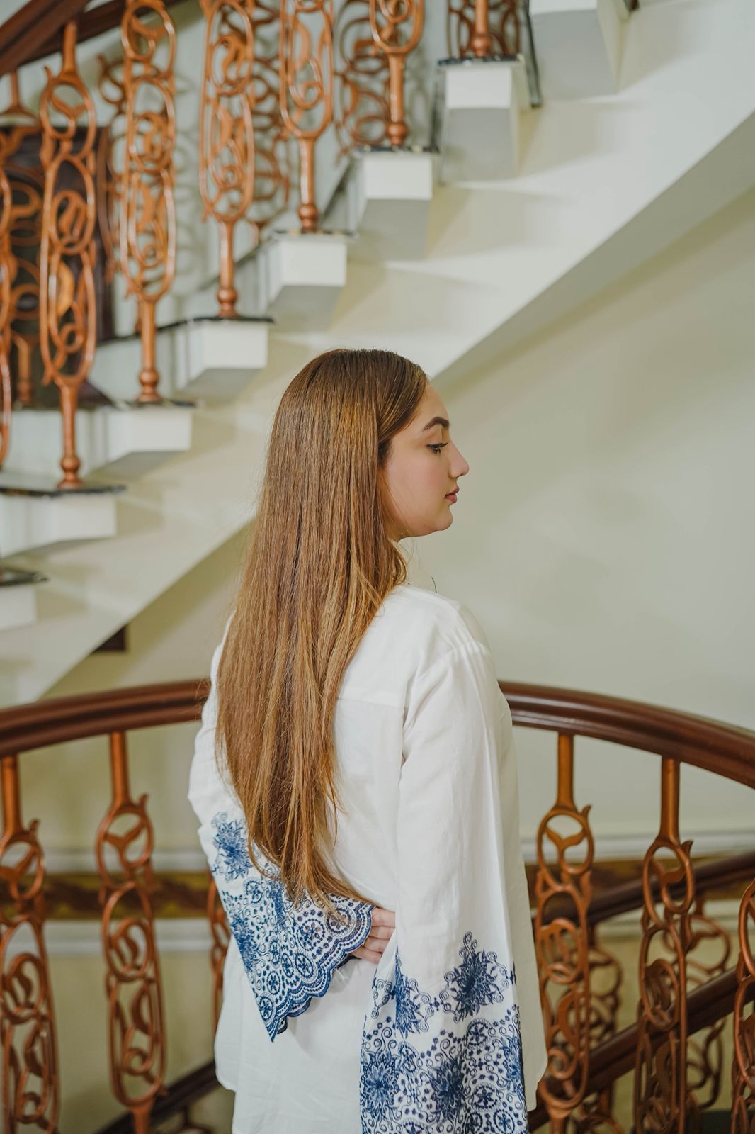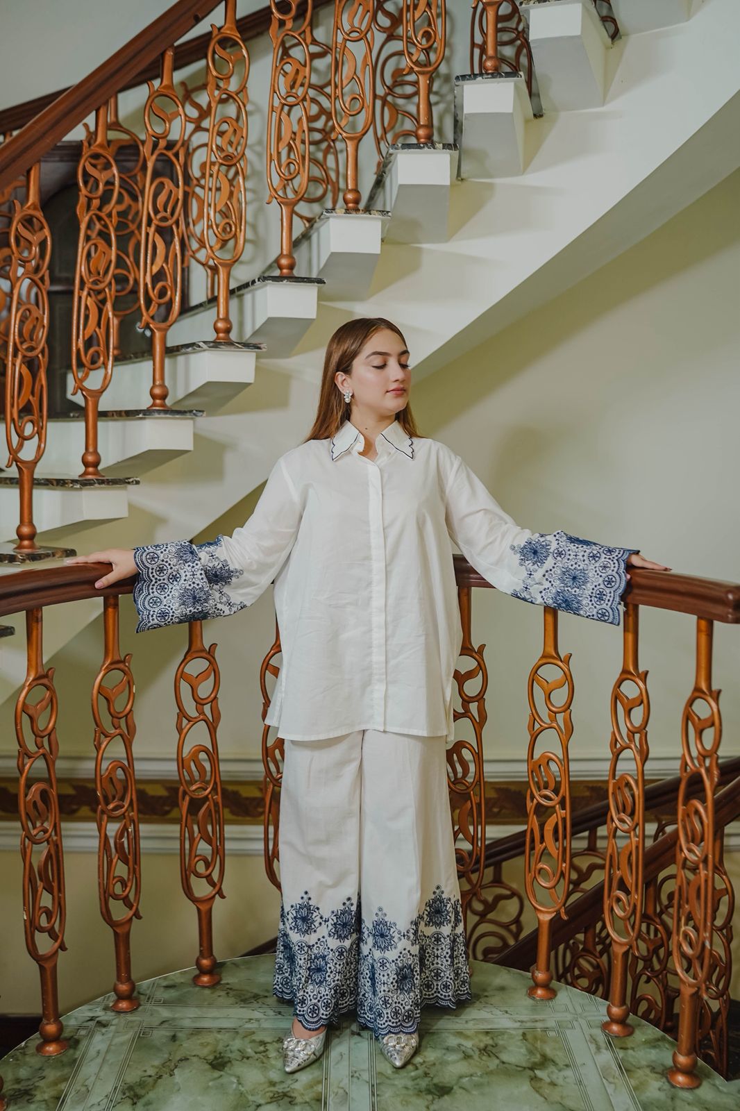 Woman sitting on a staircase wearing a white outfit with blue floral patterns, with a &