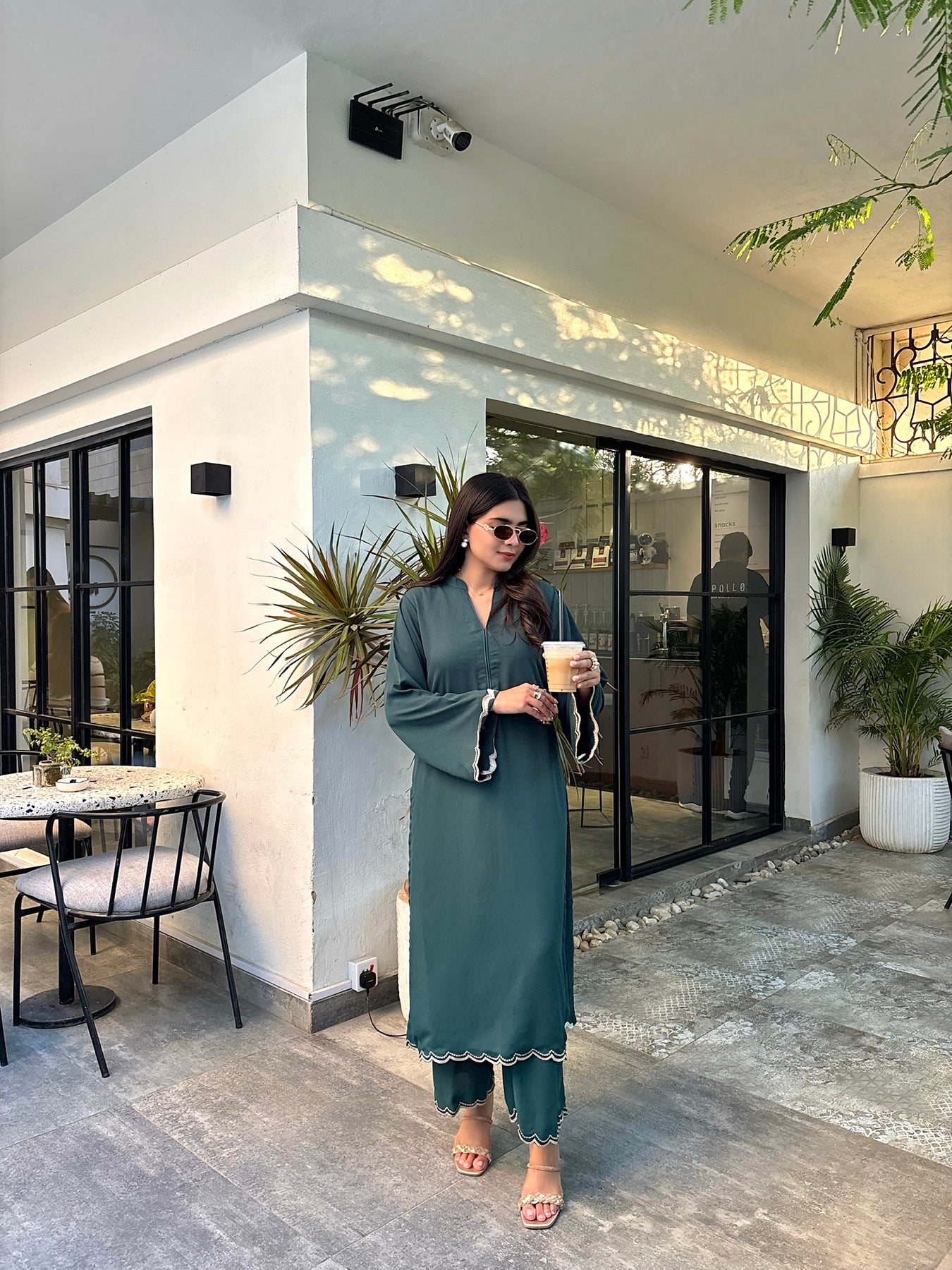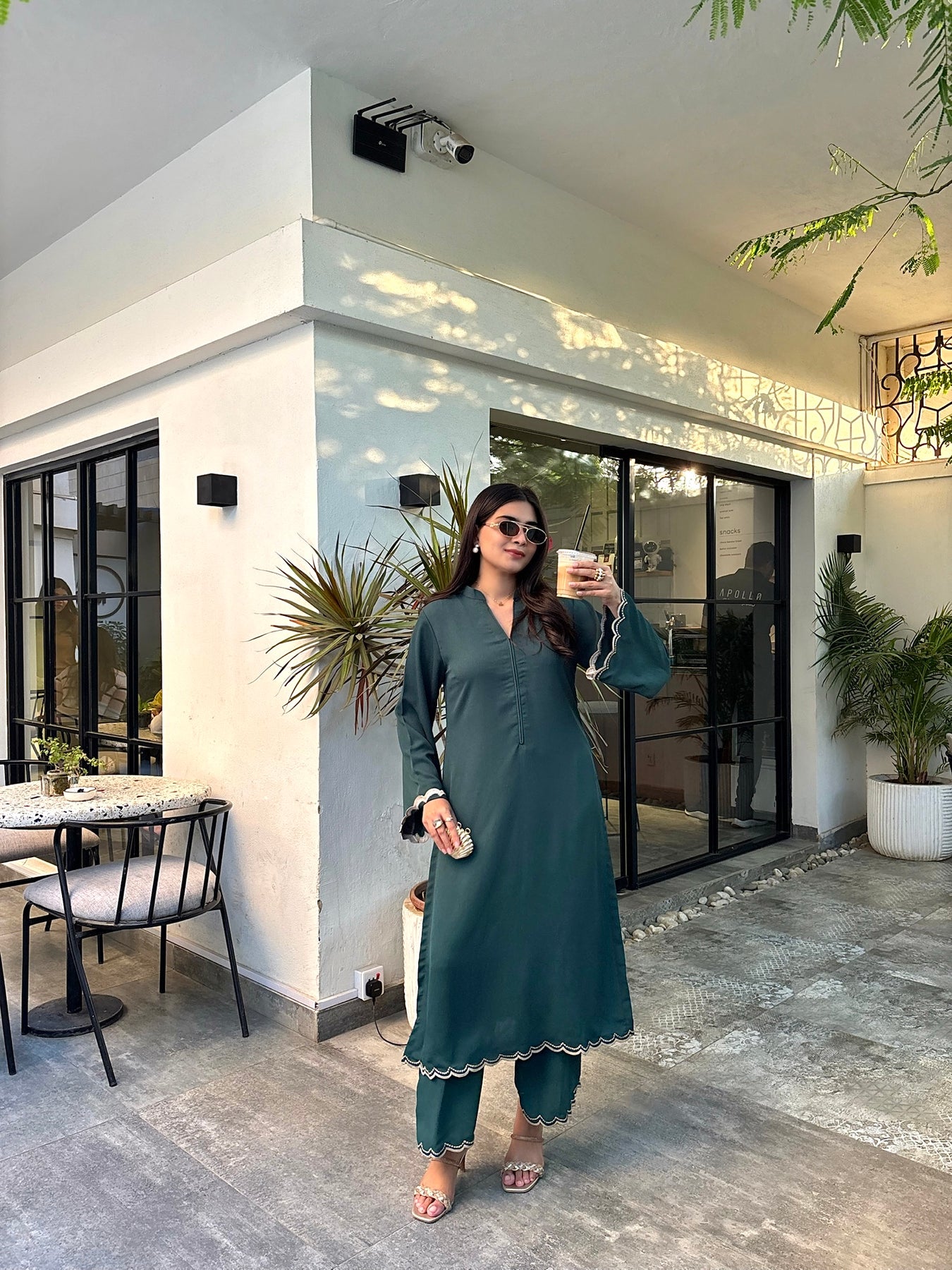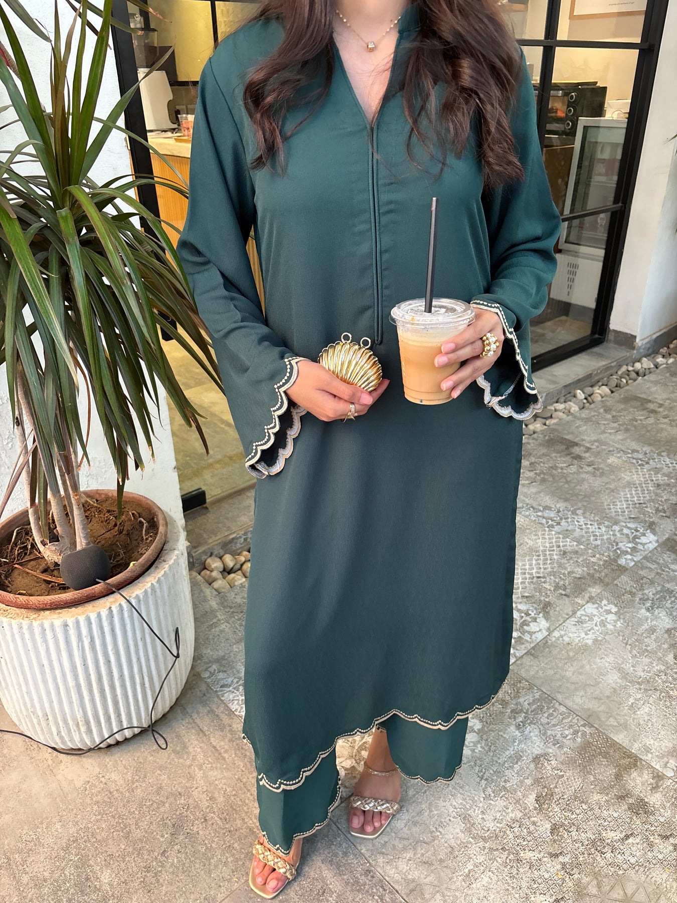 Green Forest is a refined bottle green two piece ensemble designed for understated elegance.