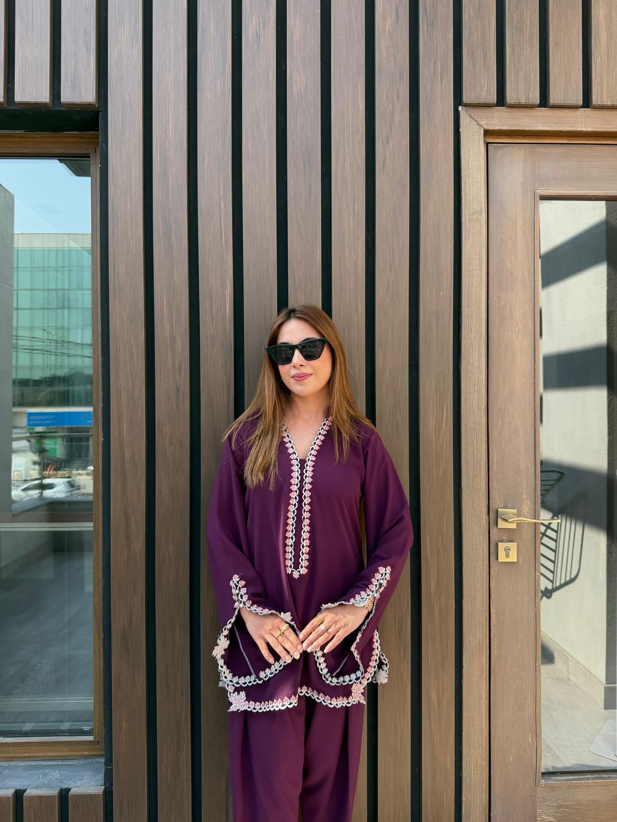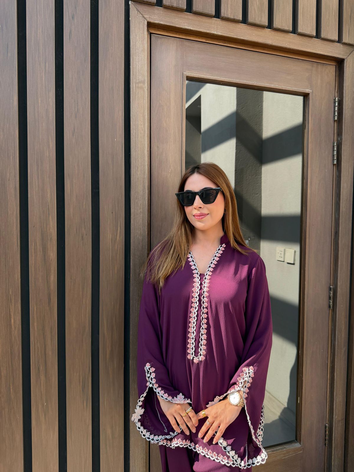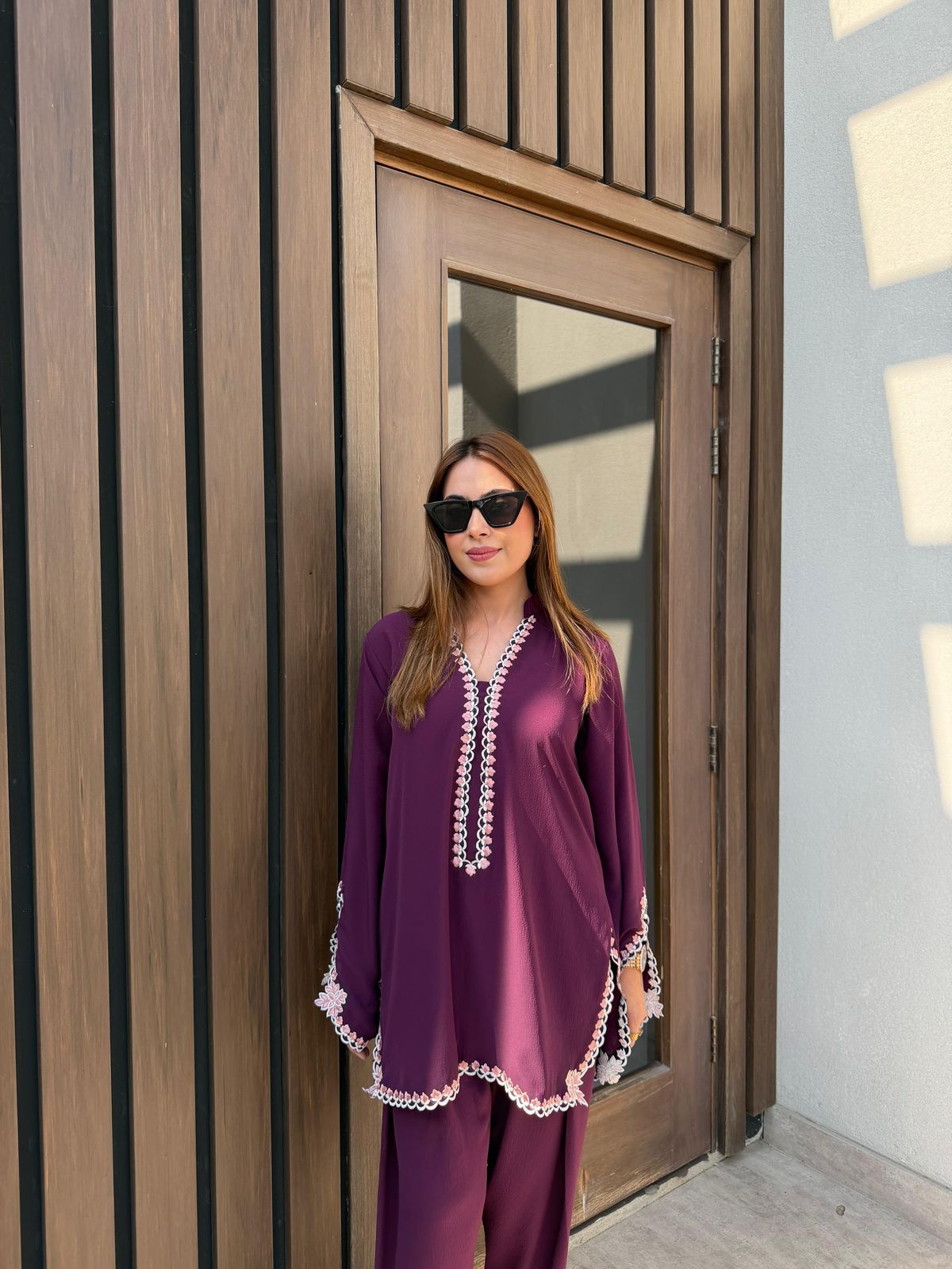 A rich plum embroidered two pieces set featuring a short, flowy tunic with intricate white and pink embroidery along the neckline, sleeve cuffs, and hem, paired with matching shalwar