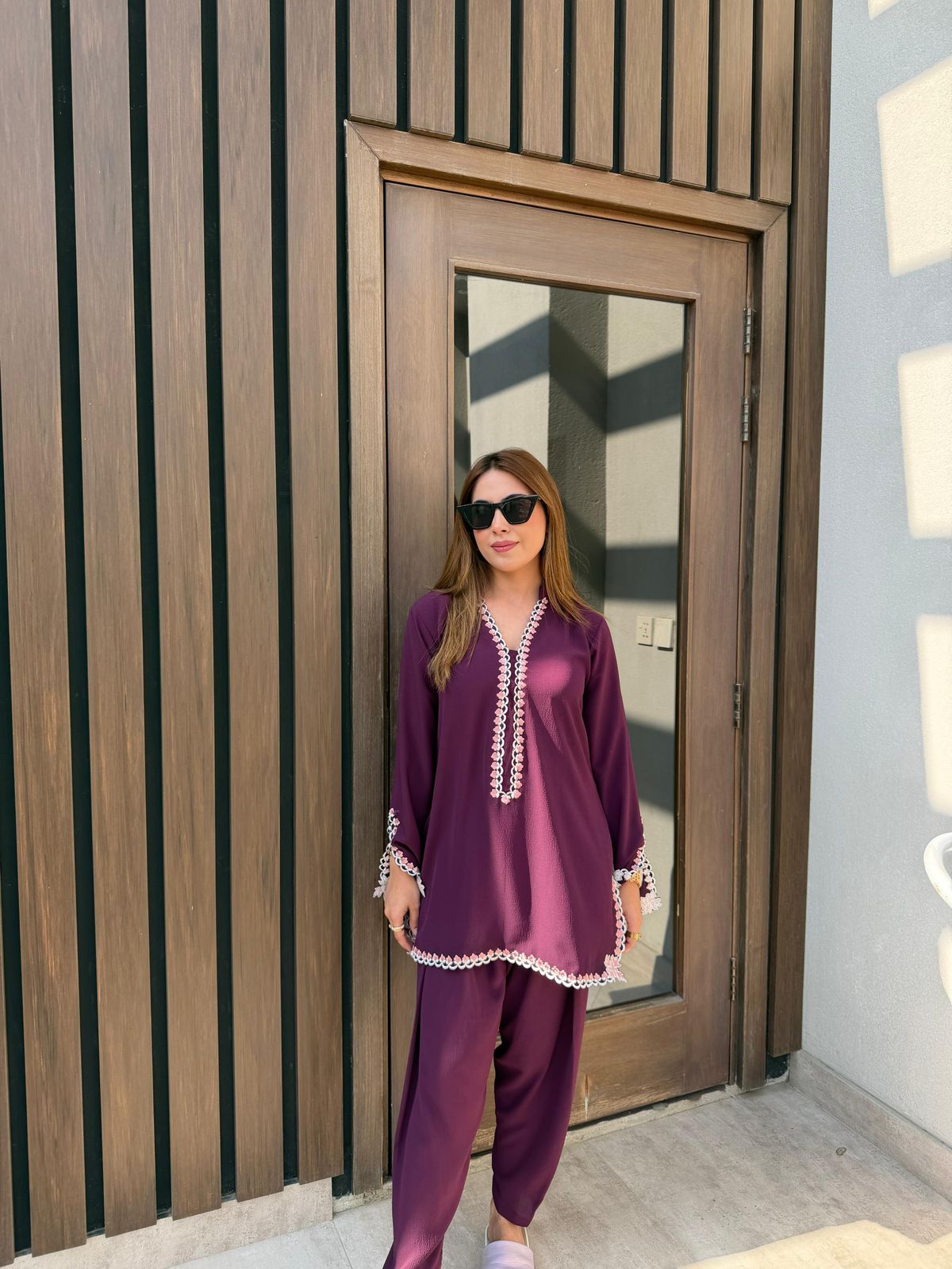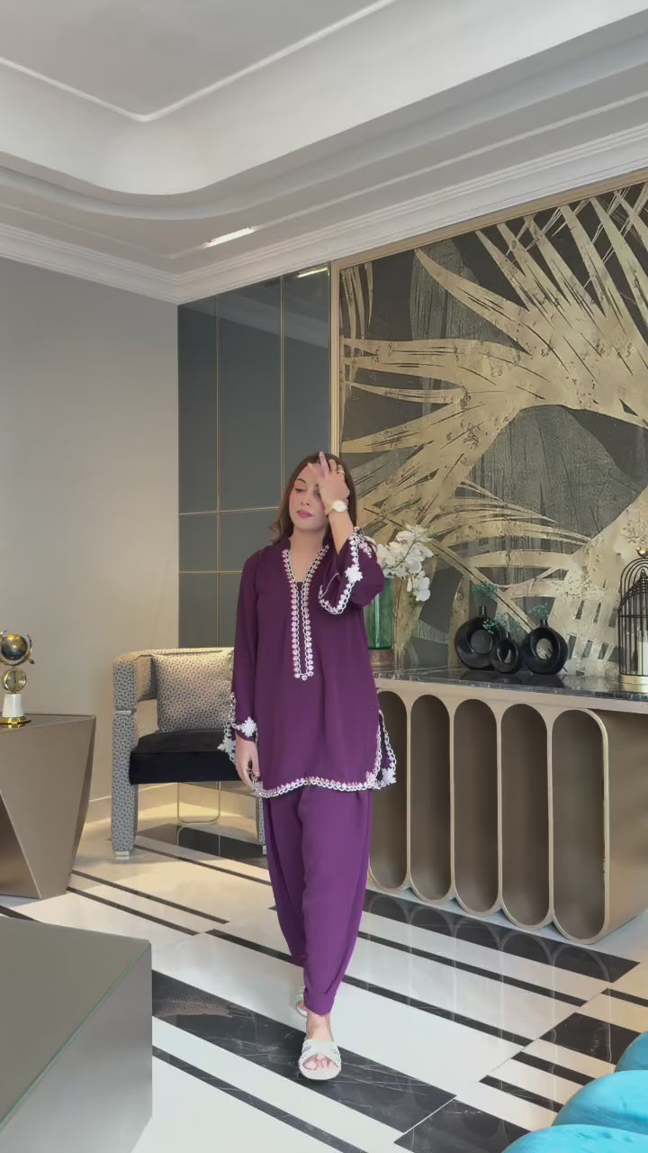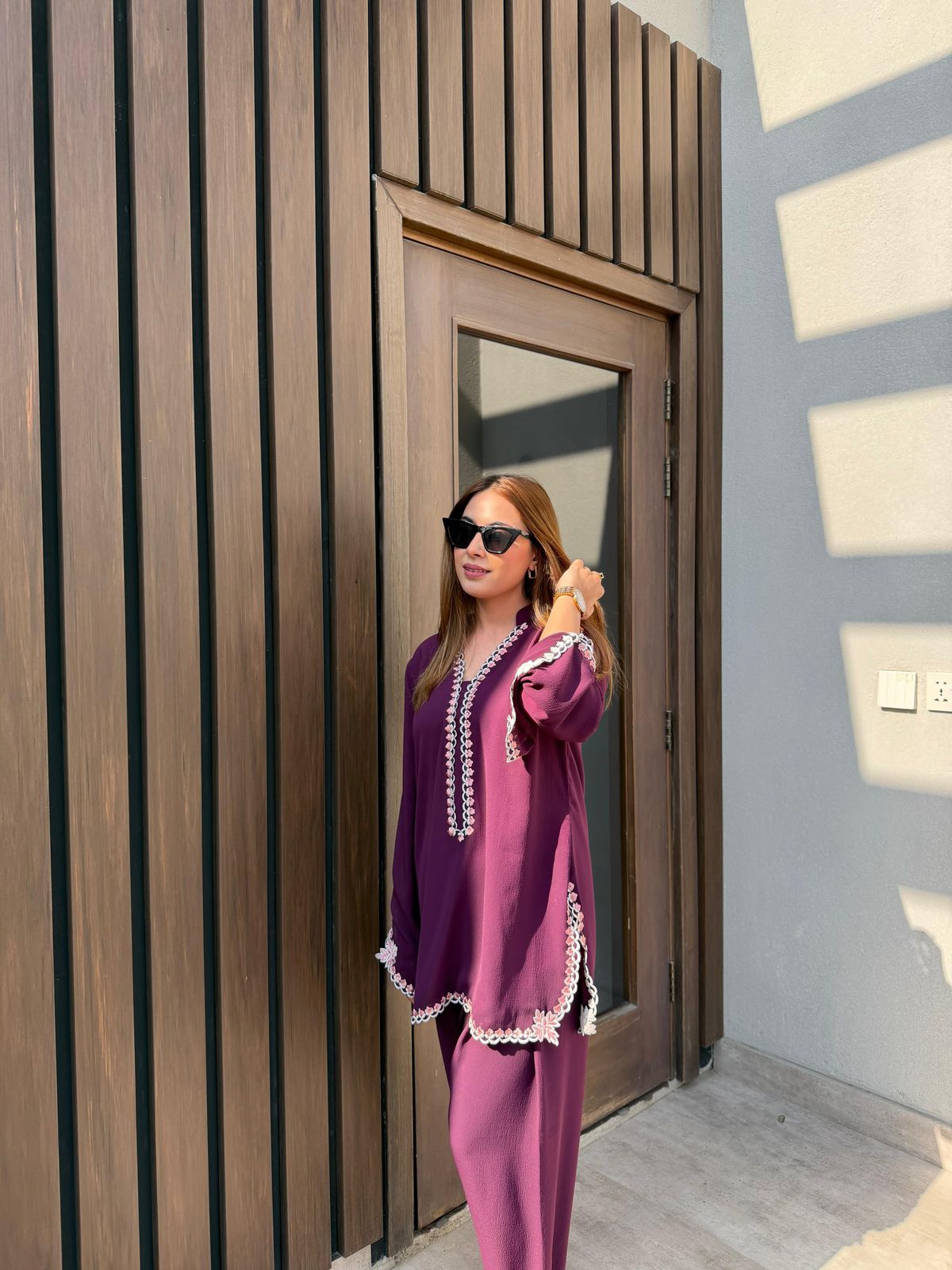 A rich plum embroidered two pieces set featuring a short, flowy tunic with intricate white and pink embroidery along the neckline, sleeve cuffs, and hem, paired with matching shalwar
